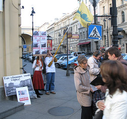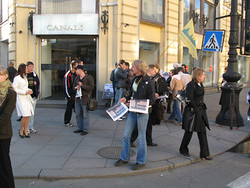 К разочарованию репортеров, тут же был найден компромисс – милиционеры препроводили активистов к Невскому проспекту, подальше от сувенирных лавок, и после еще нескольких минут препирательств и звонков начальству милостиво разрешили проводить уже согласованный с властями пикет на пересечении Большой Морской улицы и Невского проспекта. Впрочем, пикетчики такому повороту даже обрадовались – ведь прохожих на главном городском проспекте много больше, чем туристов на Дворцовой.