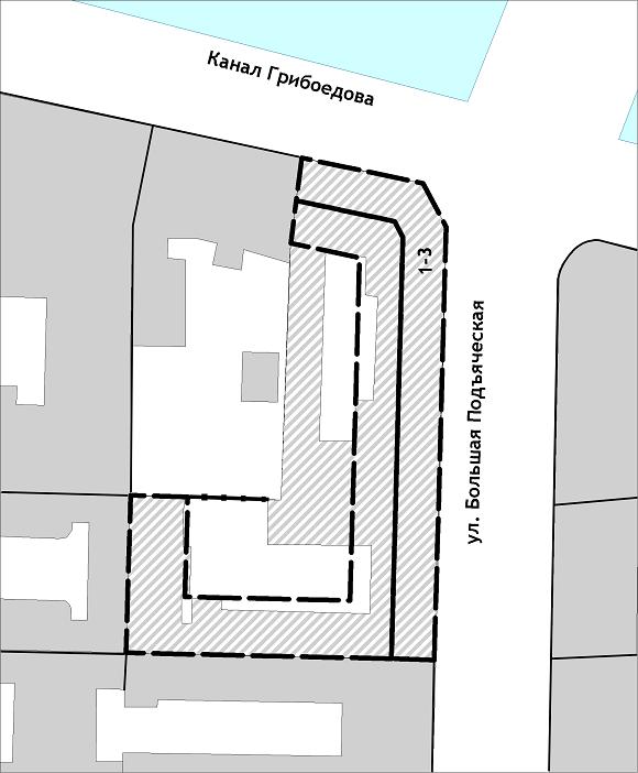 Одним из последних примеров такого расселения собирается стать дом № 1–3 по Большой Подъяческой. Произведём расчёт рыночной стоимости земельного участка дома методом «Остатка» в соответствии с методикой (утверждена распоряжением Министерства имущественных отношений Российской Федерации N 568-р от 6 марта 2002 года «Об утверждении методических рекомендаций по определению рыночной стоимости земельных участков»).