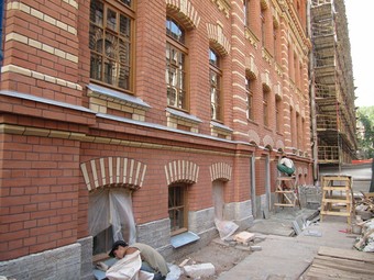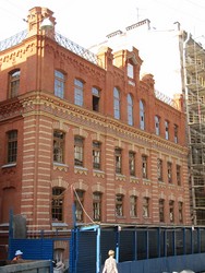 Главный фасад лицевого флигеля сохранен в составе нового комплекса гостиницы «Crown Plaza Ligovsky».