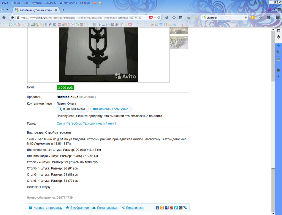 Сегодня утром градозащитники обнаружили объявление на «Авито»: частное лицо выставило на продажу балясины из регионального памятника. «XIX век. Д. 61 по Садовой ранее принадлежал князю Шаховскому. В этом доме жил М. Ю. Лермонтов в 1836-1837 гг.» написано на сайте.