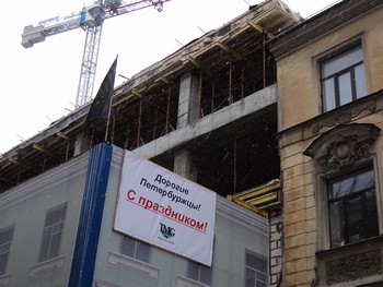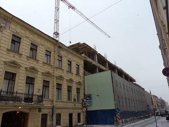 На Галерной 6 начали строить уже шестой этаж новостройки, которая возводится на месте уничтоженного после «вердикта» Татьяны Славиной дома второй половины 18 века.